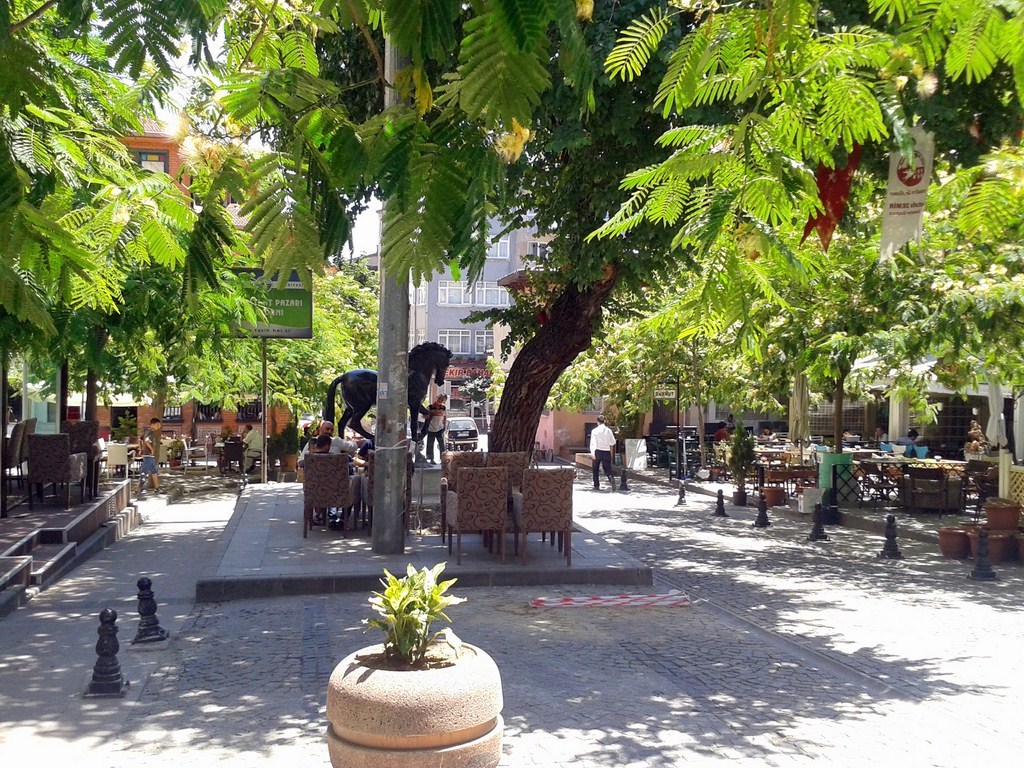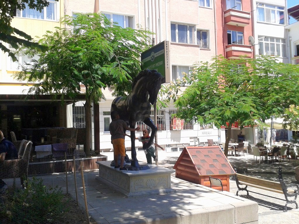 Meydana eski günleri hatırlatması için bir at heykeli konulmuş.