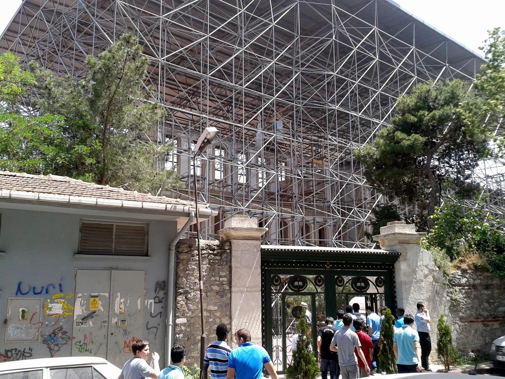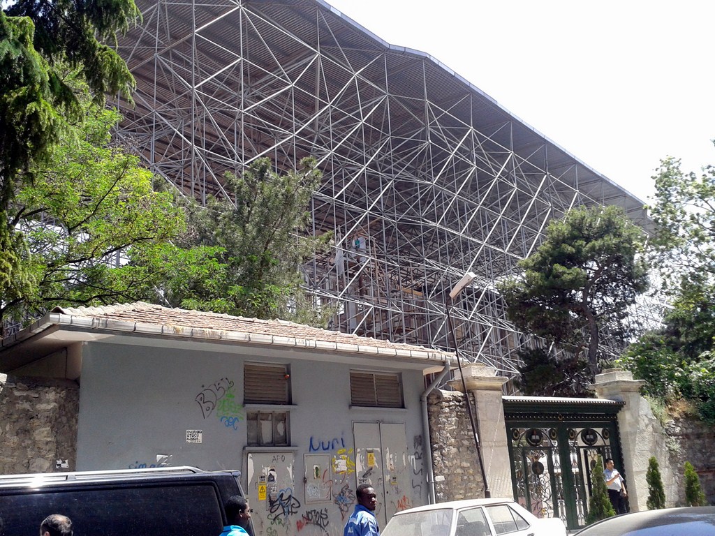 Bina çatısının kötü durumda olması sebebiyle iskele kurularak restorasyon sırasında su almaması sağlanmış