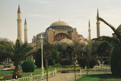 Fatih döneminde Ayasofya’ya bir minare eklenir. İkinci minare II. Bayezit döneminde, diğer iki minare de II. Selim döneminde Mimar Sinan tarafından yapılır. Mihrap çevresi çini ve hat sanatının oldukça güzel örneklerini içerir. Bunlardan 7.5 m. çapındaki yuvarlak levhalar en ilgi çekici olanlardır. Bu levhalarda Allah, Muhammed, Ömer, Osman, Ali, Hasan, Ebu Bekir ve Hüseyin isimleri yazılıdır. Mihrabın yan duvarlarında Osmanlı padişahlarının yazıp buraya hediye ettiği levhalar bulunuyor.