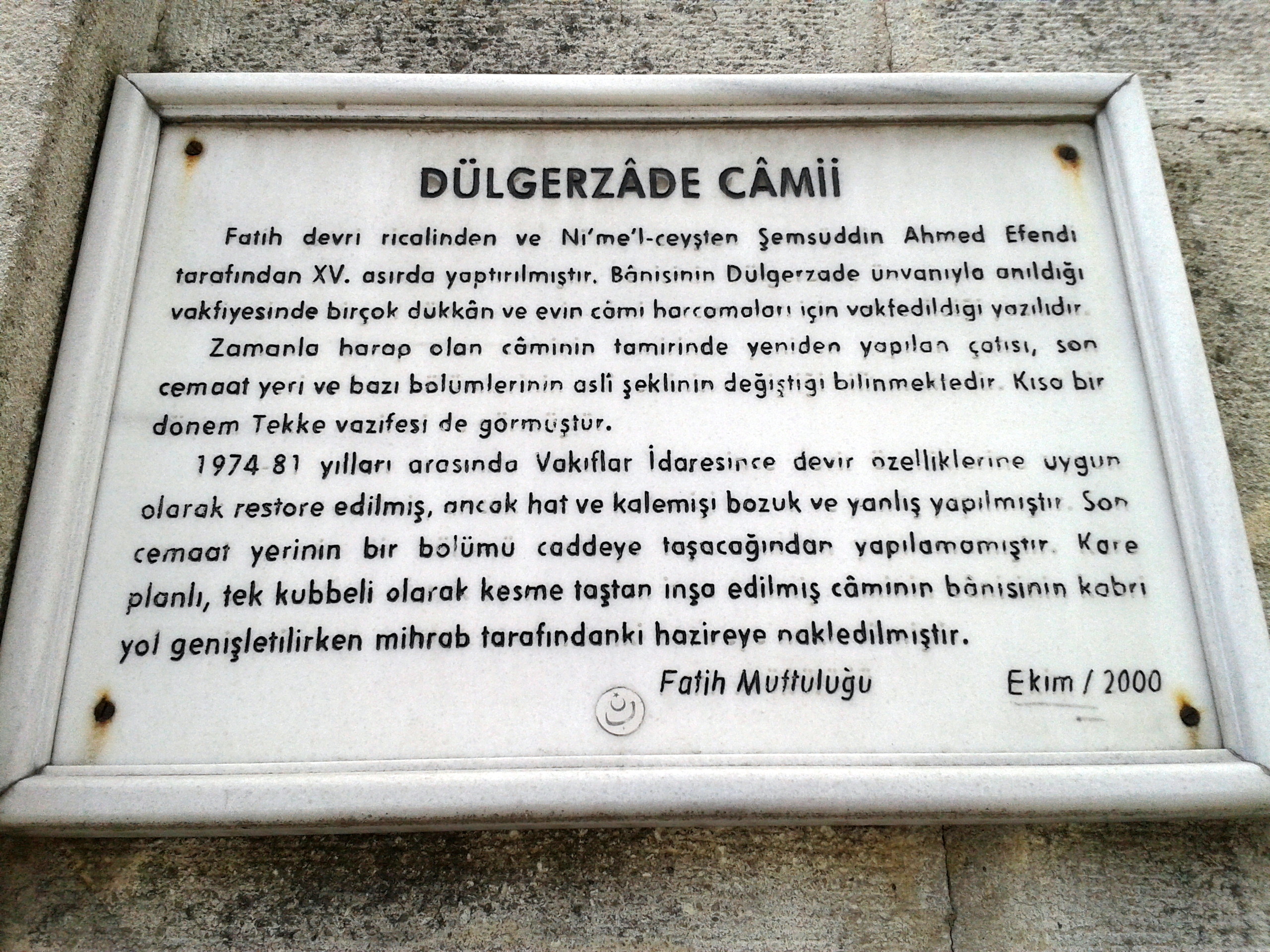 “Fatih devri ricalinden ve Ni’me’l-ceyşten Şemsüddin Ahmed Efendi tarafından 15. asırda yaptırılmıştır. Banisinin Dülgerzade ünvanıyla anıldığı vakfiyesinde birçok dükkân ve evin cami harcamaları için vakfedildiği yazılıdır.